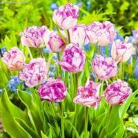 Размер луковицы 11-12 см. Тюльпан Нормандия (Normandie) Тюльпан Нормандия относится к группе махровые поздние, период цветения приходится на май, образуя роскошные, пышные цветы белоснежного оттенка с нежно-фиолетовыми штрихами по краям нежных лепестков. Высота бокала 6-8 см, а диаметр при роспуске 10-12 см. Продолжительность цветения 8-10 см источая нежный, тонкий аромат. Высота тюльпана Нормандия достигает 40-50 см, стебель прочный, прямой, что позволяет держать на высоте крупный цветок.